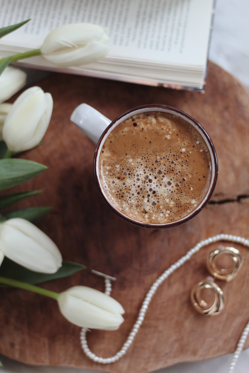 Previous Image Next Image mug of cacao with classy accessories and tulips bouquet placed on tray near book Photo by Ioana Motoc on Pexels.com
